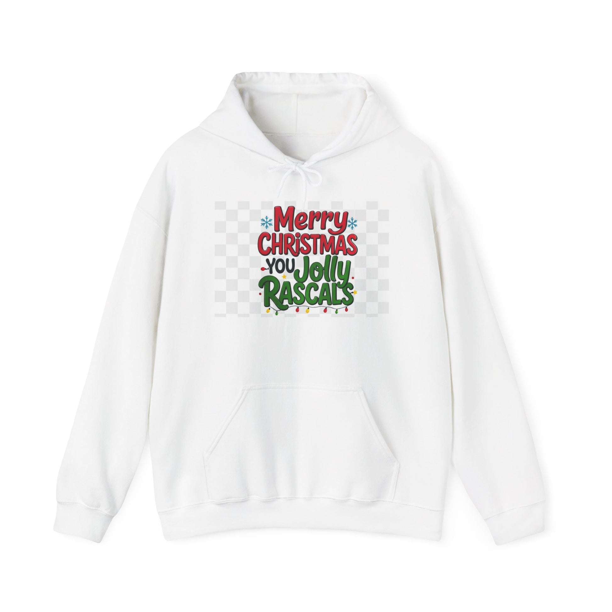 Embrace the festive spirit with this cozy Unisex Heavy Blend™ Hooded Sweatshirt, perfect for chilly winter days. Featuring a cheerful "Merry Christmas You Jolly Rascals" design, this sweatshirt brings warmth and joy to your holiday celebrations. Whether you're having a cozy night in with family, attending a festive gathering, or just out running errands, this sweatshirt is your go-to choice for comfort and style. It's an ideal gift for those who love festive apparel and appreciate a touch of fun during the holiday season. Perfect for Christmas gatherings, New Year’s celebrations, and cozying up by the fire.