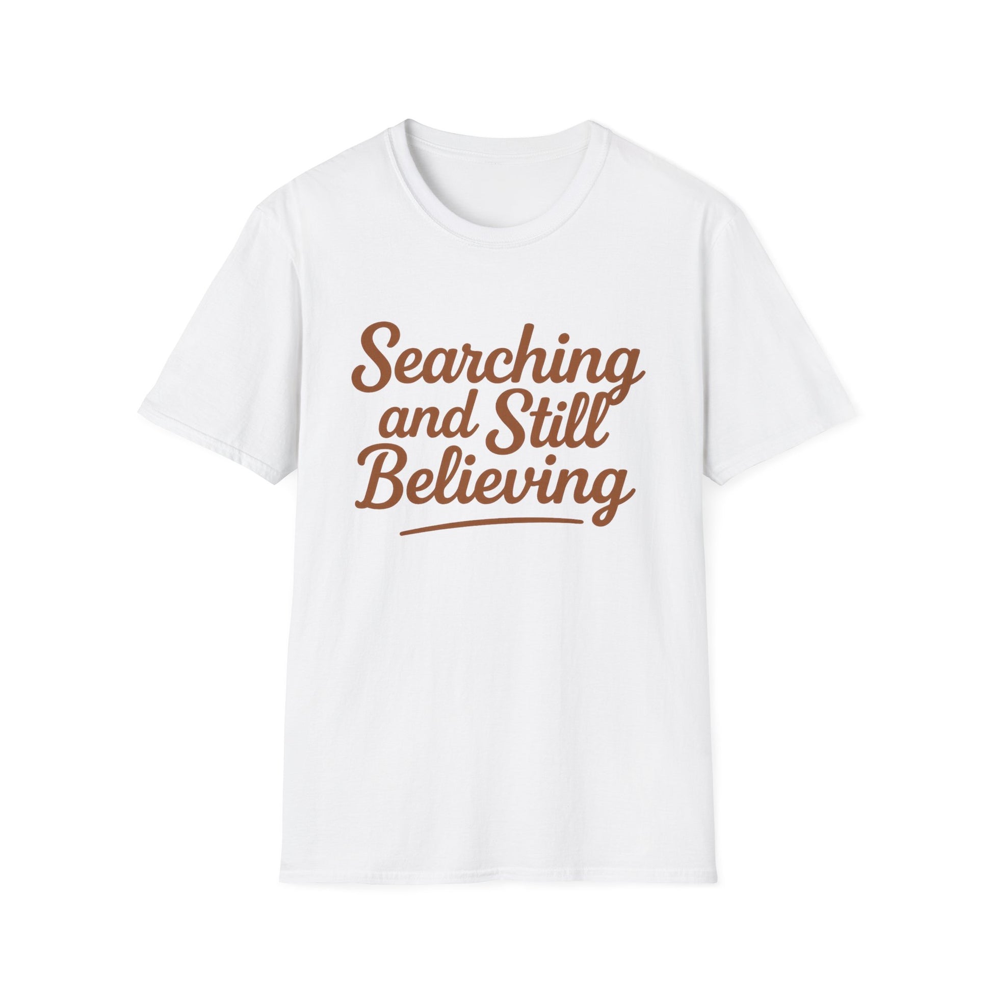Embrace your spiritual journey with our 'Searching and Still Believing' Christian T-shirt. This inspirational tee is designed for those who have faith and believe in the power of belief. Made from soft, breathable fabric, it ensures all-day comfort while spreading a positive message. Ideal for both men and women, this Faith Journey T-shirt is perfect for casual outings, church events, or as a thoughtful gift for loved ones on their Christian journey. Wear it with pride and share your faith with the world!